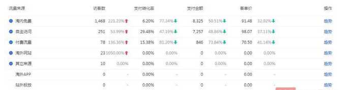 这是一张无线端流量来源的截图,可以很清楚的看到无线端的流量可以分为以下几大块:淘内免费、自主访问、付费流量、淘外网站、其他来源、淘外APP、站外投放(如果最后两块你的店铺是有渠道做过推广的,那前面会出现蓝色的加号的,这个店是一个新店,很多都没有着手做,所以数据不是很多)。
