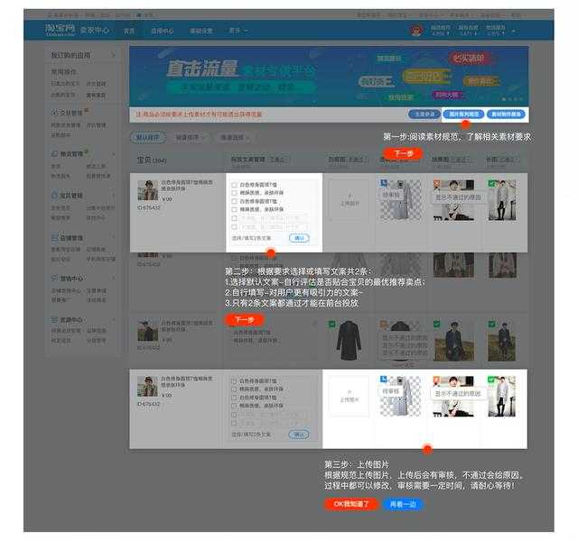 至于如何操作进入后会有提示,这里主要给大家说几个必要的提示:大家只要记清楚下边这个图审核通过是非常快的,还有就是审核没有不通过一说,只会不审核,如果一周还没有审核结果,从新检查图片在进行上传即可。淘宝免费流量大家必须争取,千人千面+用户搜索这样的转化行为转化率还是非常不错的。