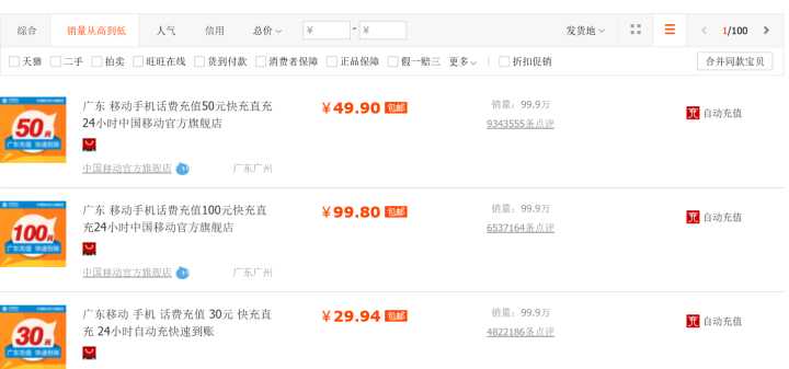 第一名是移动充值卡大概几十个店,月都是99.9w次,估计这个是封顶显示上线然后一大堆里面你可以看到偶尔有电信之类在然后就是爱奇艺然后懒得翻了