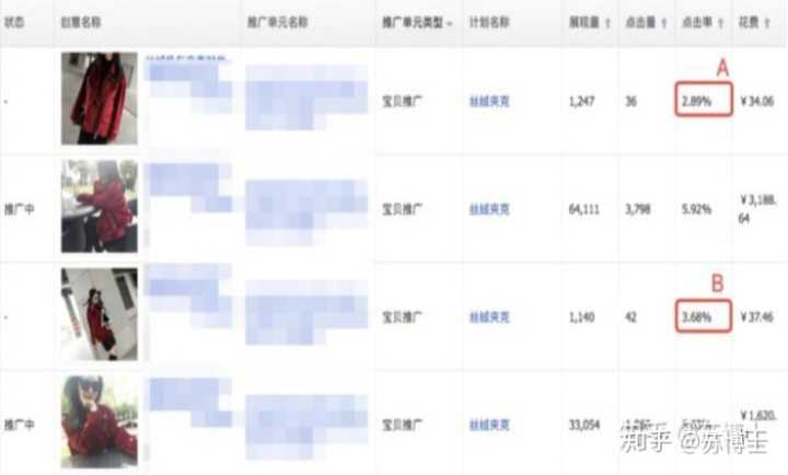 这里举个栗子,同样一件产品,有四张主图通过直通车投放,B是卖家原先使用的主图,按照个人直观感受来说的话,这张图没有任何问题,已经把能展示的内容都给买家展示了,可是根据实际投放的数据来看的话,它只有3.68%的点击率,而表现比较出色恰恰是第二张和第四张,另外第一张图片2.89%的点击率更是和其他几张主图形成鲜明的对比。