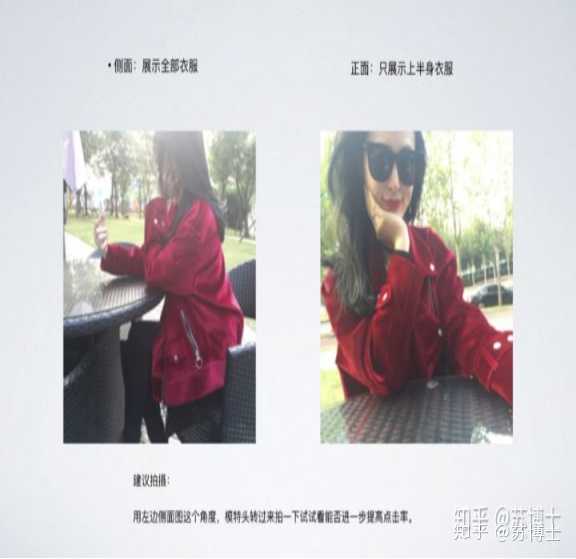 我们可以假设一下如果左图这个坐姿保持不变,但是模特的脸转过来对着观众,效果会不会更高呢?这里我只是给大家提供一个制作主图时的思考方式,因为你用不同的角度展示产品,所获取的点击率也是不一样的,希望大家能善于思考,多尝试不同的拍摄角度来展示自己的产品。