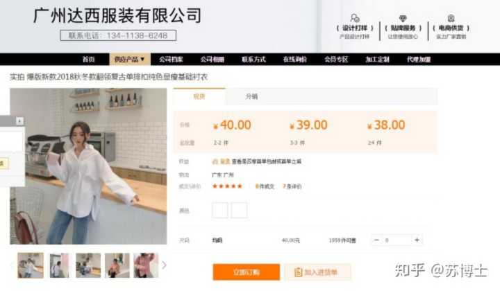 接着我们点开具体某一件产品的时候,关于这个产品供应商的细节都会展示在我们面前。包括价格、现货还是分销、买家在看、销量以及评价等等若干信息,方便我们对供应商的整体实力有一个清晰的了解。阿里巴巴这个平台可圈可点的地方就在于它会通过数据的方式帮你更好的提高决策效率。
