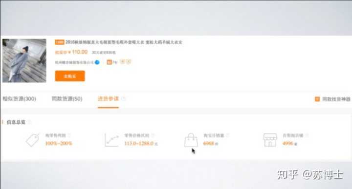 另外,我们再来分析一下产品的进货参谋,会发现一些比较有意思的数据,其中淘零售利润指的是淘宝上主流卖得好的店铺对于这款产品的售价,它的加价倍数,比如图上是100%就是加一倍,200%就是加两倍,这件大衣的批发价是110,而在淘宝零售当中它的主流价格区间在200~300,那么这件产品在淘宝上还是有利可图的。