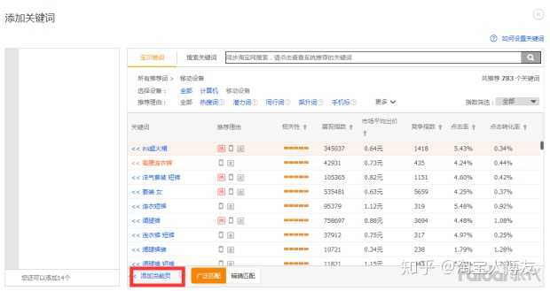 这里我们可以直接通过直通车的加词界面选出非常多的关键词,而且里面还可以利用搜索词查找来寻找更多的关键词