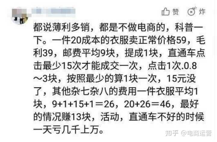 其次就是成本越来越高,利润越来越低。现在做淘宝,成本最高的不是人工,货品,而是流量。淘宝开店都是免费的,然后交一些保证金就可以,这个成本不高。但是现在不比10年前了,那个时候不怎么做推广,也有不少自然流量进来,或者花点钱,就可以导入大量的流量,成本很低。但现在直通车、钻展等淘宝搞出的广告位,一天投入上万,可能都引不了多少流量,可能转化还低。比如有一位做服装的卖家就说,一件衣服卖59元,衣服成本20元,邮费平均9元,直通车一单要花15元,扣除后还剩15元,还有人工、水电等成本,有的时候直通车效果不好,亏几千都有可能,所以,做到薄利多销才可能赚钱,不然就是亏本。其实,这个钱都被阿里赚了,一年上千亿的利润,都是从卖家身上赚来的。