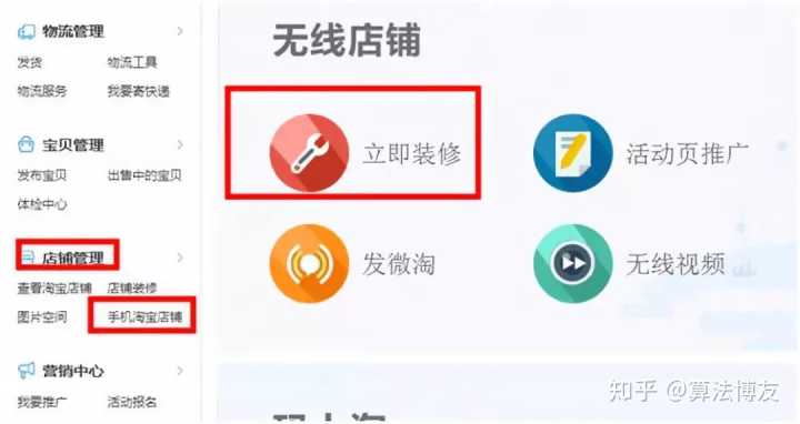 打开卖家中心,店铺管理,手机淘宝店铺,然后点击立即装修,如下图3所示: