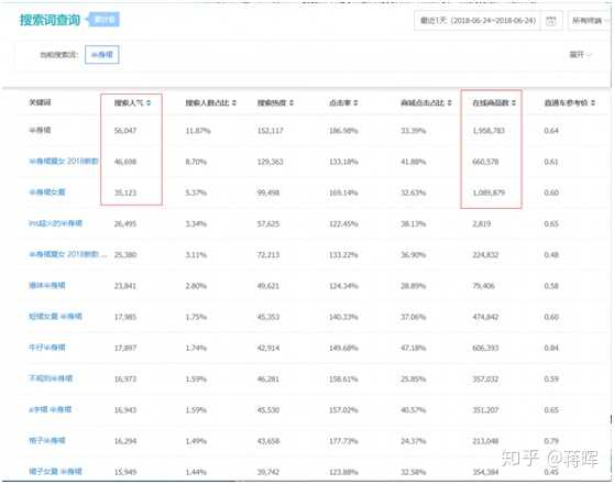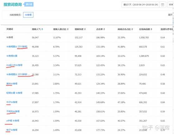 从数据可以看出半身裙这个关键词的搜索量是56047,半身裙夏女 2018新款是46698。这里可以看出两个关键词的搜索量差不多,半身裙比半身裙夏女 2018新款多9349。