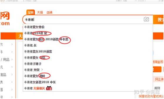 在淘宝搜索框中搜索半身裙,下拉框会出现很多相关选项,或在生意参谋搜索。二级分词代表着一个品类的人群需求,就是这个品类有哪些人群需求是要看这个品类人群搜索哪些二级关键词。比如2018款、复古、中长款、印花、荷叶等等,这些就是细分的人群需求关键词。