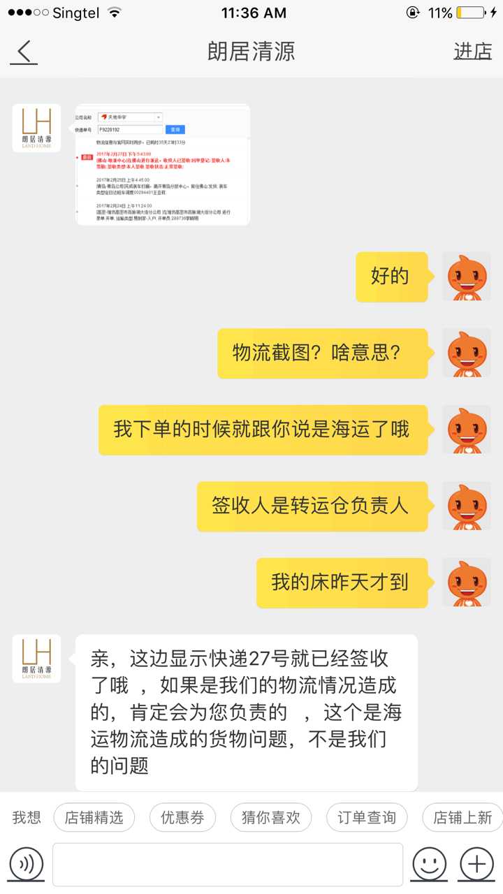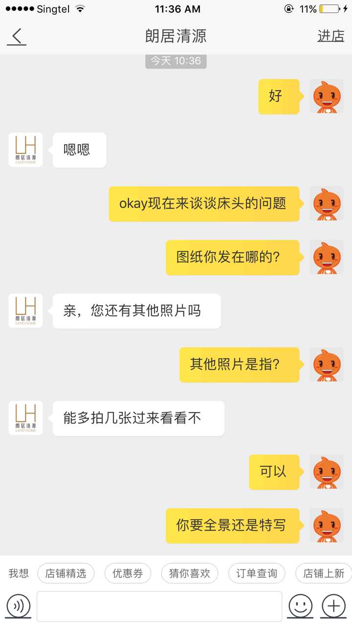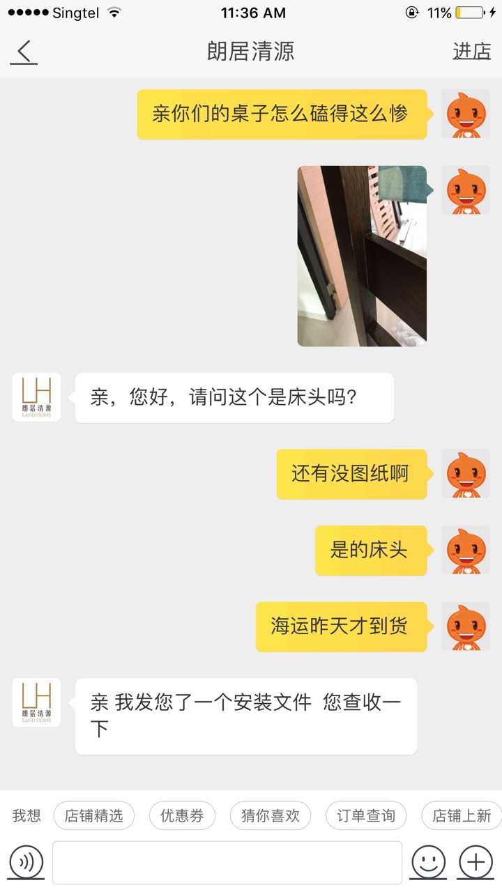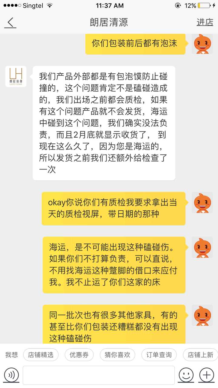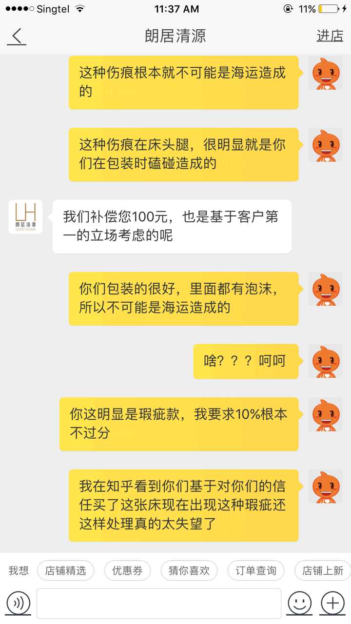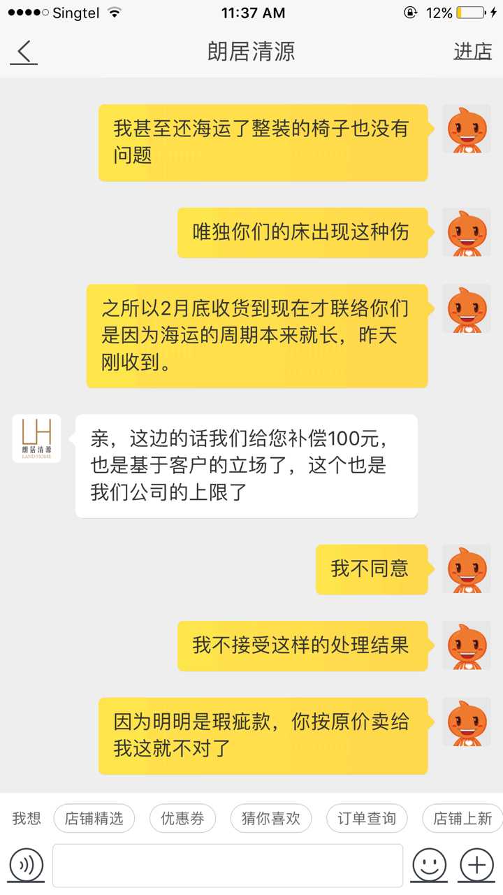 现在床终于到了,发现床头有瑕疵,联络了店家,这是他们的回复和态度。