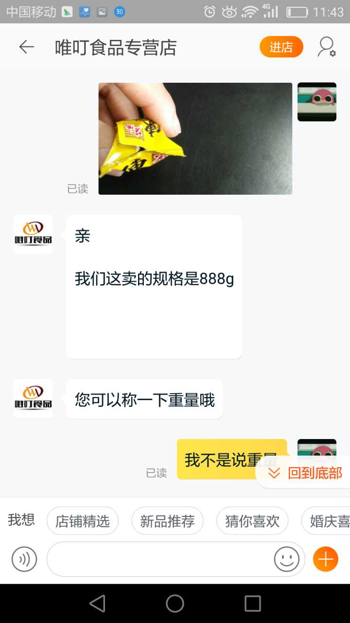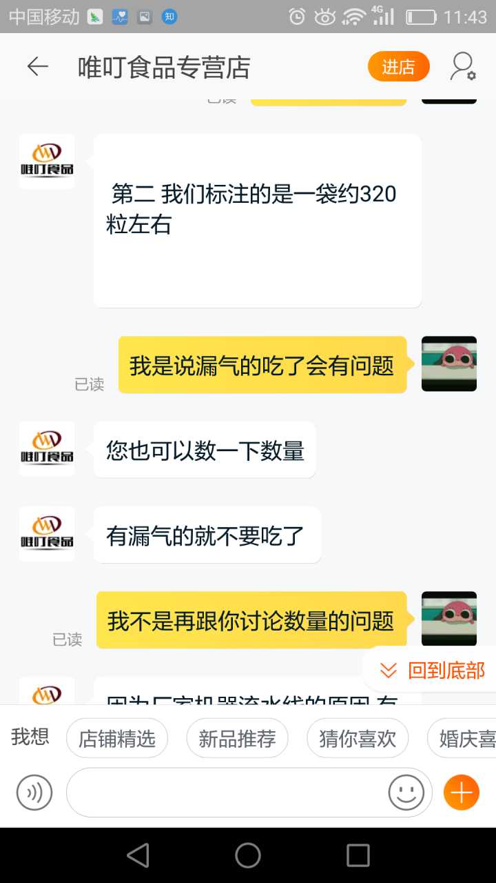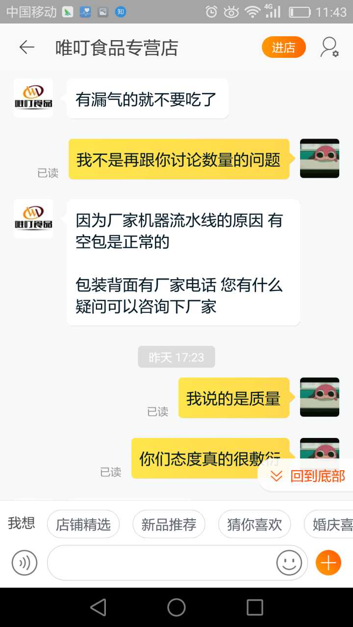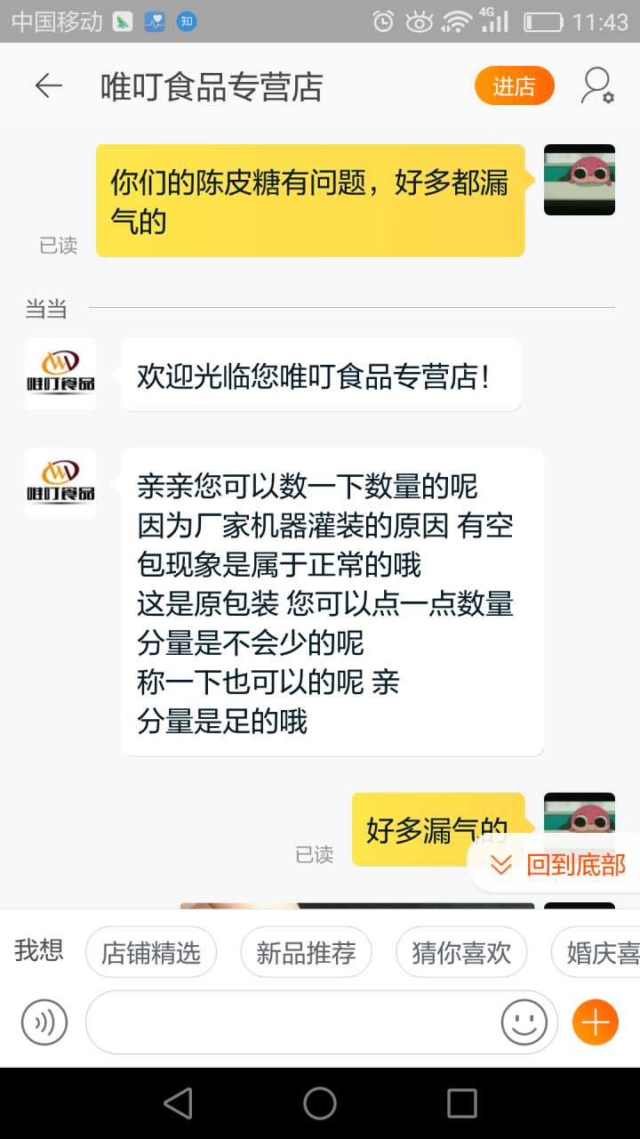 我一般收到不好的产品,要么退货要么和卖家协商解决。因为这包糖我已经拆封了,退货是不可能的,所以我去询问了客服,希望他给我个说法。其实如果客服能安抚下我的情绪,这事也就过去了,关键是,我遇到了一个奇葩客服!!