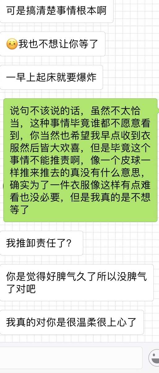 不是淘宝,但确实是一次糟心的购物经历私人代购,卖衣服的,微博上见有人推荐就加了,买了一件champion一件thrasher都暂时没出现什么问题。最后一次买一件champion的上衣,一直在等,等到半个月的时候就开始催卖家发货,卖家最开始说发货了,后面要单号的时候又说忘记发了,然后再等了一段时间,结果等来的却是衣服发之前要检查但是袖口是坏的之类的理由,承诺过年之前一定能发到,结果最后又转口风说管仓库的人回家过年了,又承诺在月底发到。其实这本来不是多大的事情,但是卖家的态度实在是恶劣,一副你爱买不买的态度,贴一些聊天记录换句话说,就算是你朋友把仓库钥匙拿走了,那这也是你推卸责任的理由吗?既然要出来做生意麻烦端正你自己的态度,把拿来练嘴炮和跟人撕的功夫和本事用来提升自己的业务水平。最让人无语的是卖家包括她的朋友还一直来加好友,语气也不是太好,总觉得我在无缘无故的骂他们,需要把完整的聊天记录贴出来看一下是谁骂谁吗?