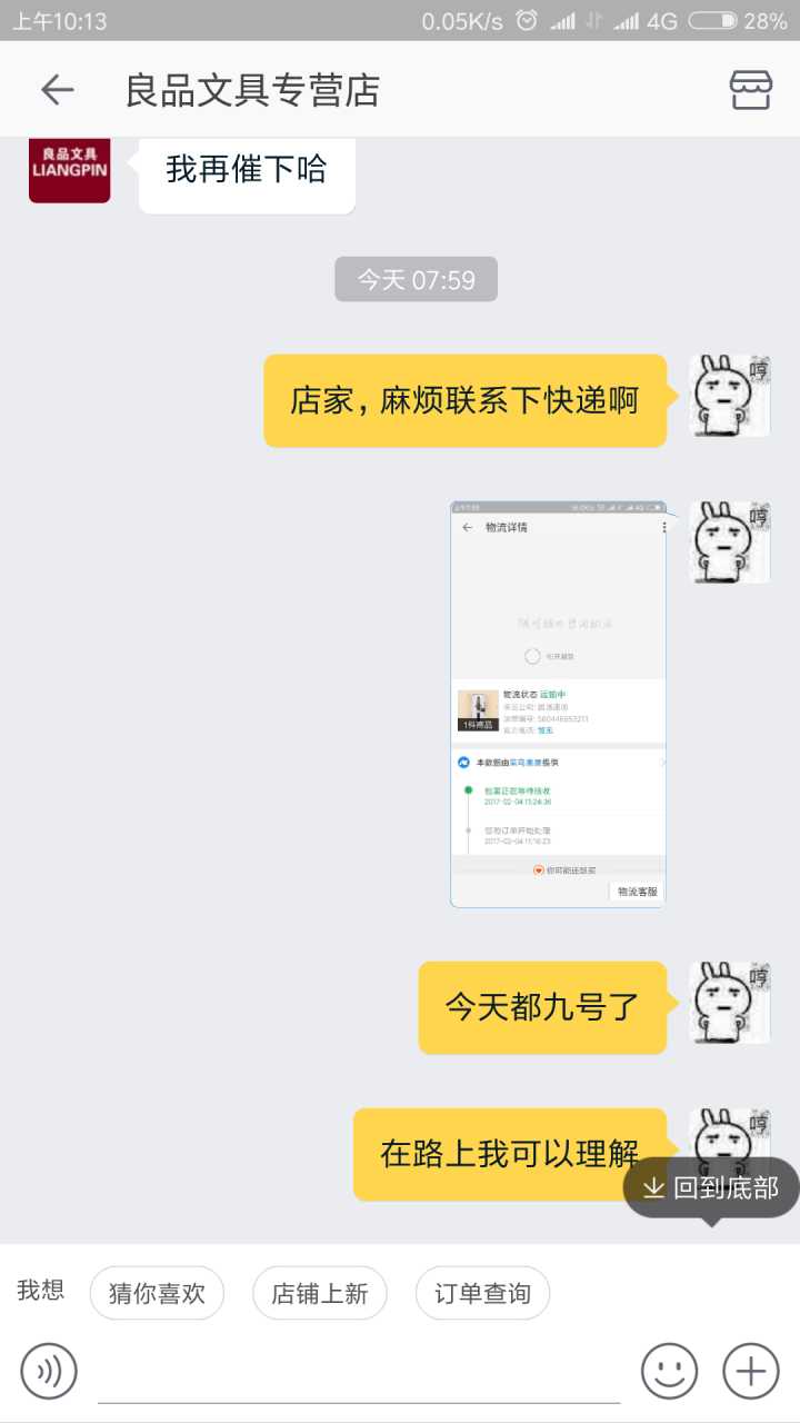 看图,很气人,我这有特殊情况,只有圆通才能到,所以一般买东西前我都会问店家能不能发圆通,能发我才下单。然后这特么的,我天天问怎么还没动还没动,我买的是钢笔,字帖和墨水都到了好久了,笔还没动你让我多尴尬,算了还是看图吧