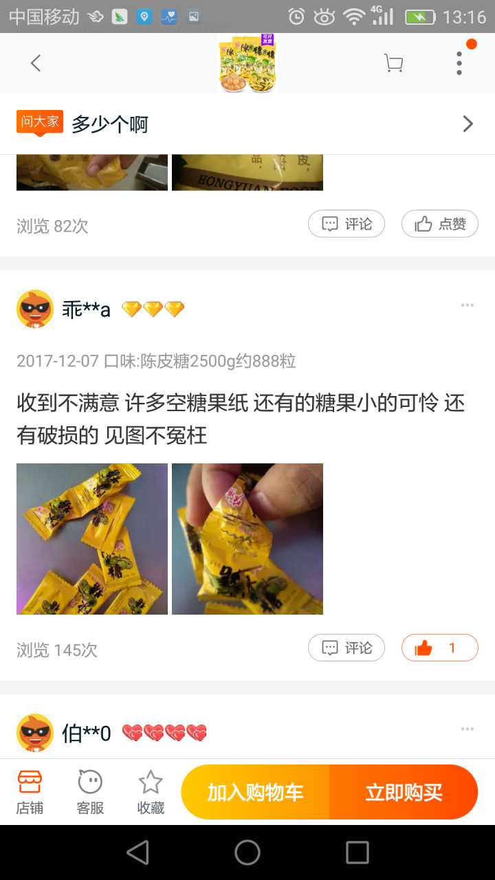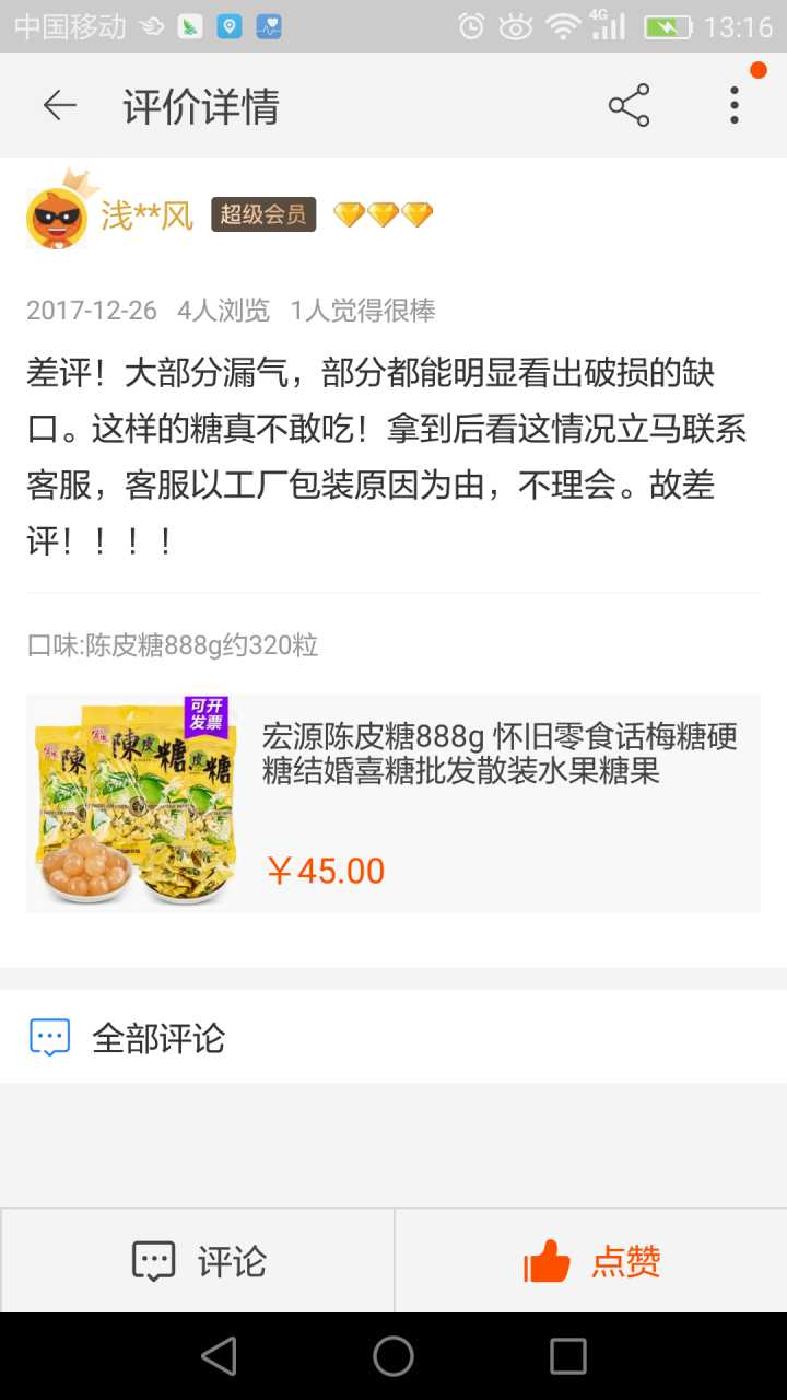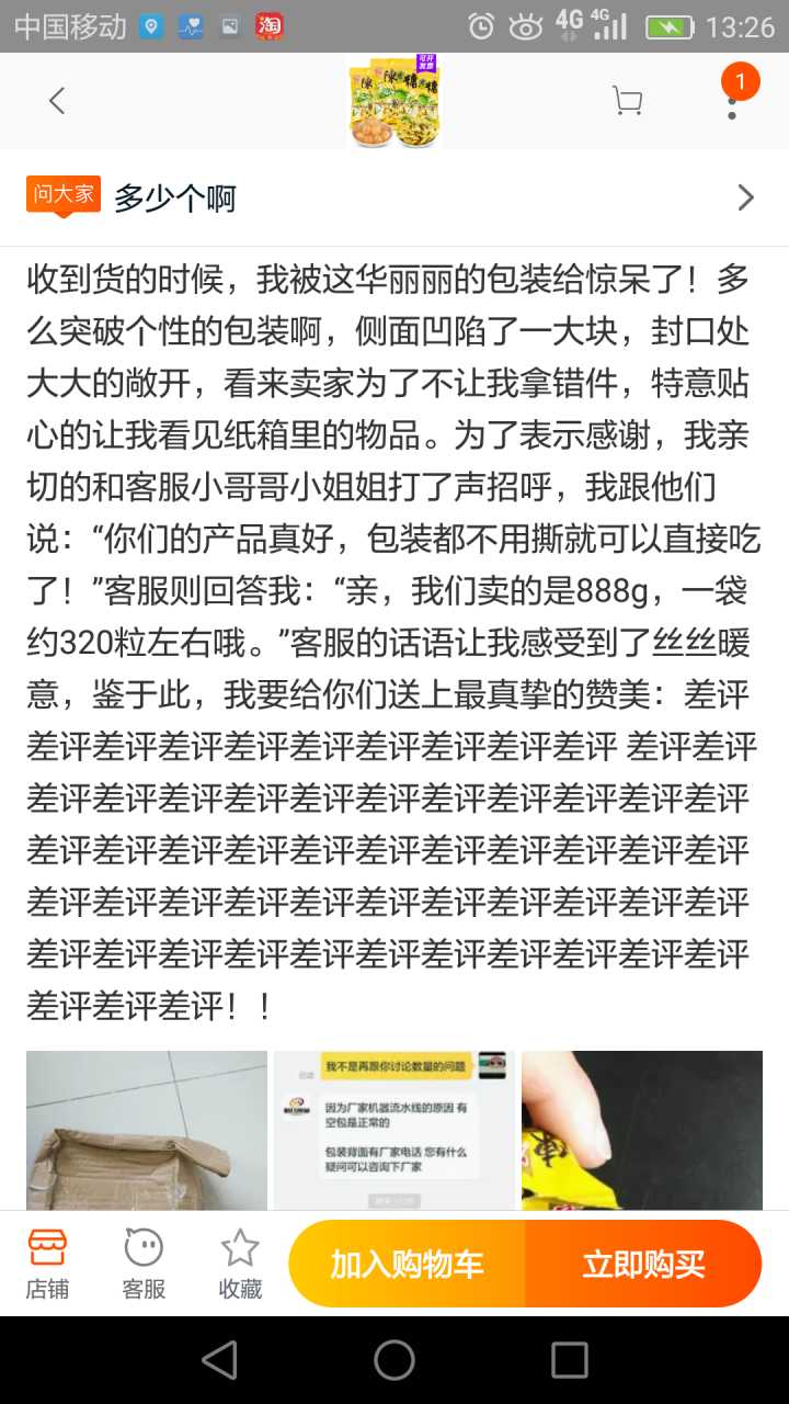 我跟客服说:“你们产品好多漏气的。”客服回:“这包糖888g,一包约320粒左右哦。”excuse me?我问你这包糖多重了吗?我说你们寄少了吗?这是哪门子的转移话题,太没水平了!