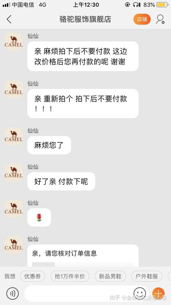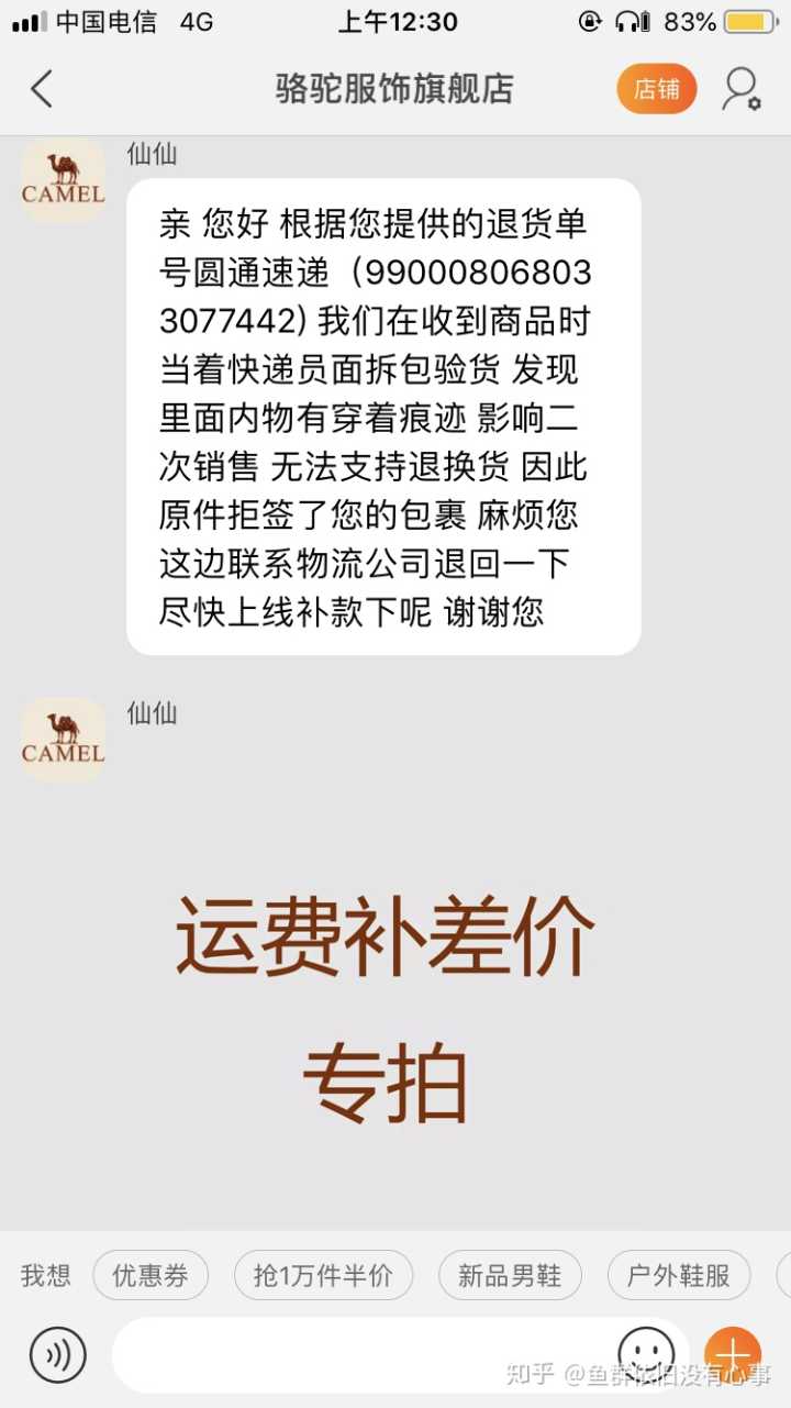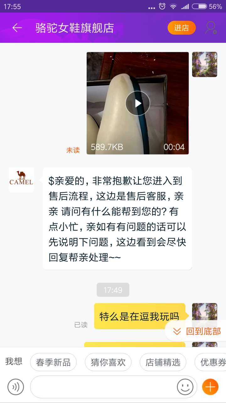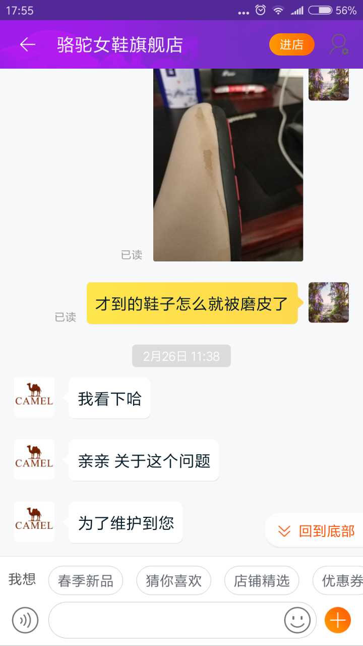 在淘宝骆驼女鞋旗舰店买了个鞋,26号到货,嗯,皮被磨了,我要求换货 客服同意了,很好,心心念念等了8天,到货了,好高兴,一看特么还是磨皮的,还是我之前买的那双,啥都不说了,一生黑
