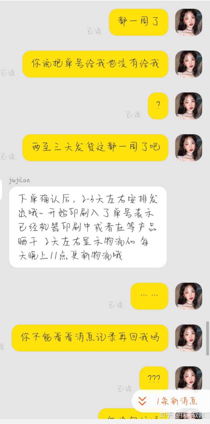 私人代购,卖衣服的,微博上见有人推荐就加了,买了一件champion一件thrasher都暂时没出现什么问题。最后一次买一件champion的上衣,一直在等,等到半个月的时候就开始催卖家发货,卖家最开始说发货了,后面要单号的时候又说忘记发了,然后再等了一段时间,结果等来的却是衣服发之前要检查但是袖口是坏的之类的理由,承诺过年之前一定能发到,结果最后又转口风说管仓库的人回家过年了,又承诺在月底发到。其实这本来不是多大的事情,但是卖家的态度实在是恶劣,一副你爱买不买的态度,贴一些聊天记录