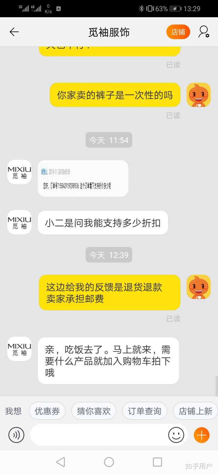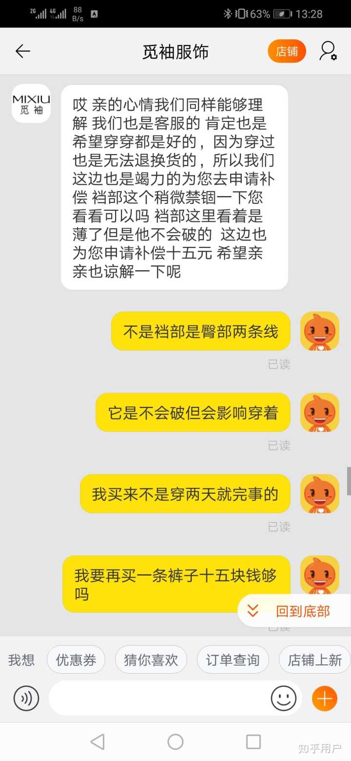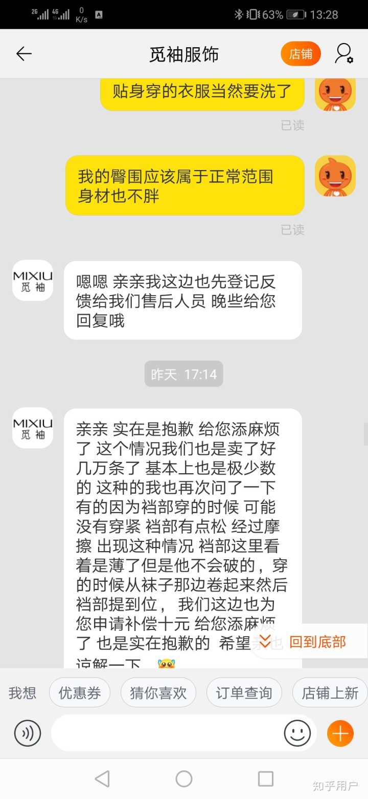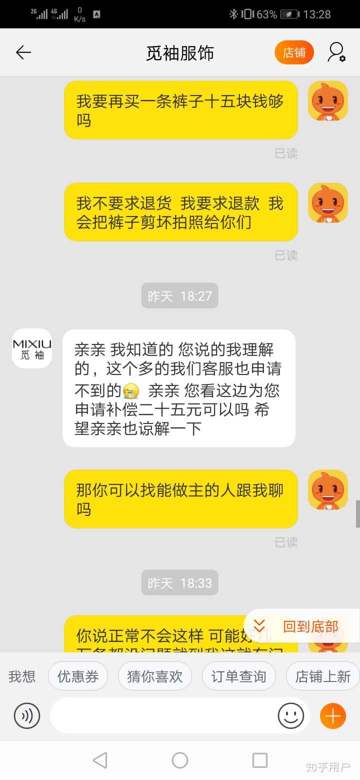 大概来说我的要求就是退货退款卖家承担运费,或者我把裤子剪了拍照给他,他给我退全款。但卖家的客服一直说这不是他们的问题,买了几万条只有我有这种情况出现,我笑,难道我屁股上长了一把剪子吗。