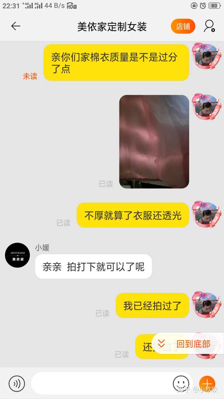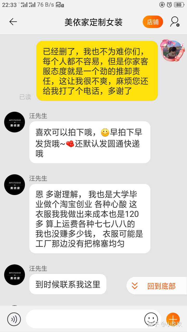 我向小二反映了卖家不准备退货的态度,现在还没收到回复。这是我第一次淘宝购物因为质量问题维权,也不知道之后结果会如何,先写到这里,之后的结果我会再补充,不管有没有人看。 总之这家店已经上了我的黑名单,从白月光变成了粘饭粒了。