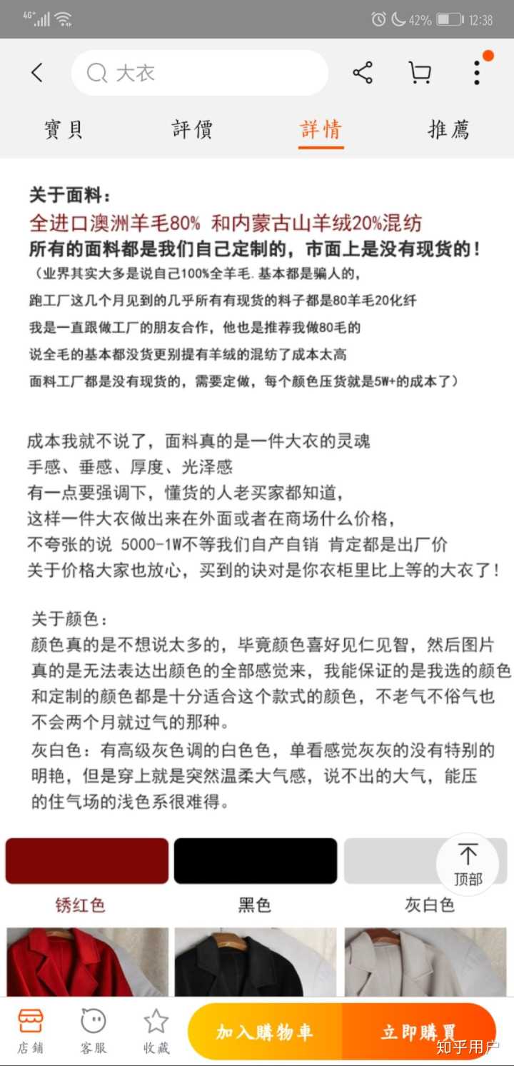 如果真的买过纯羊毛大衣的人应该知道,羊毛大衣是非常轻的,羊绒就更不用说了,更轻,却非常暖和.我把自己的大衣拿出来称,才刚好一斤,而那件所谓羊毛羊绒混纺的却整整四斤,你们自己想想得掺了多少杂物.而且走线很地摊,面料看着也一言难尽,之前买的时候有多期待,收到时候就有多愤怒.