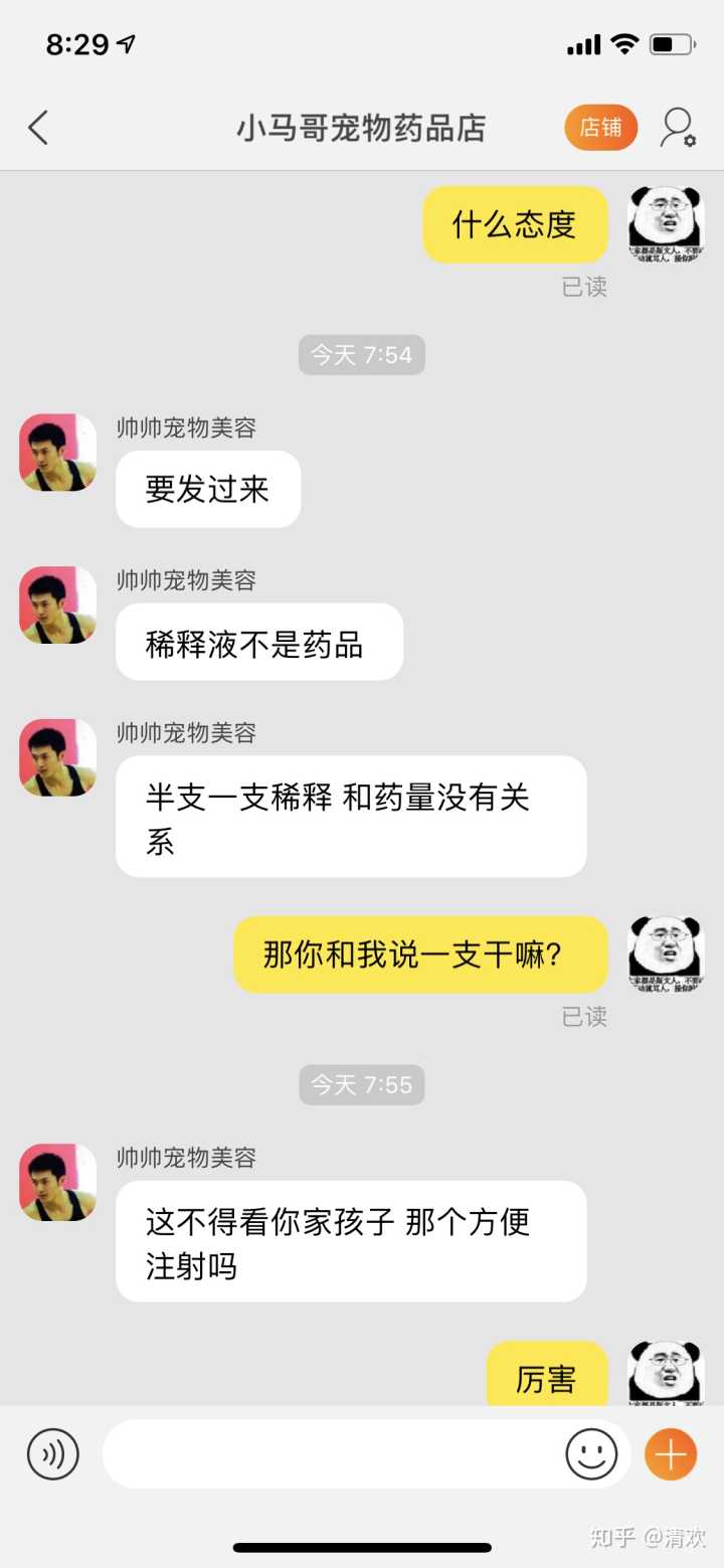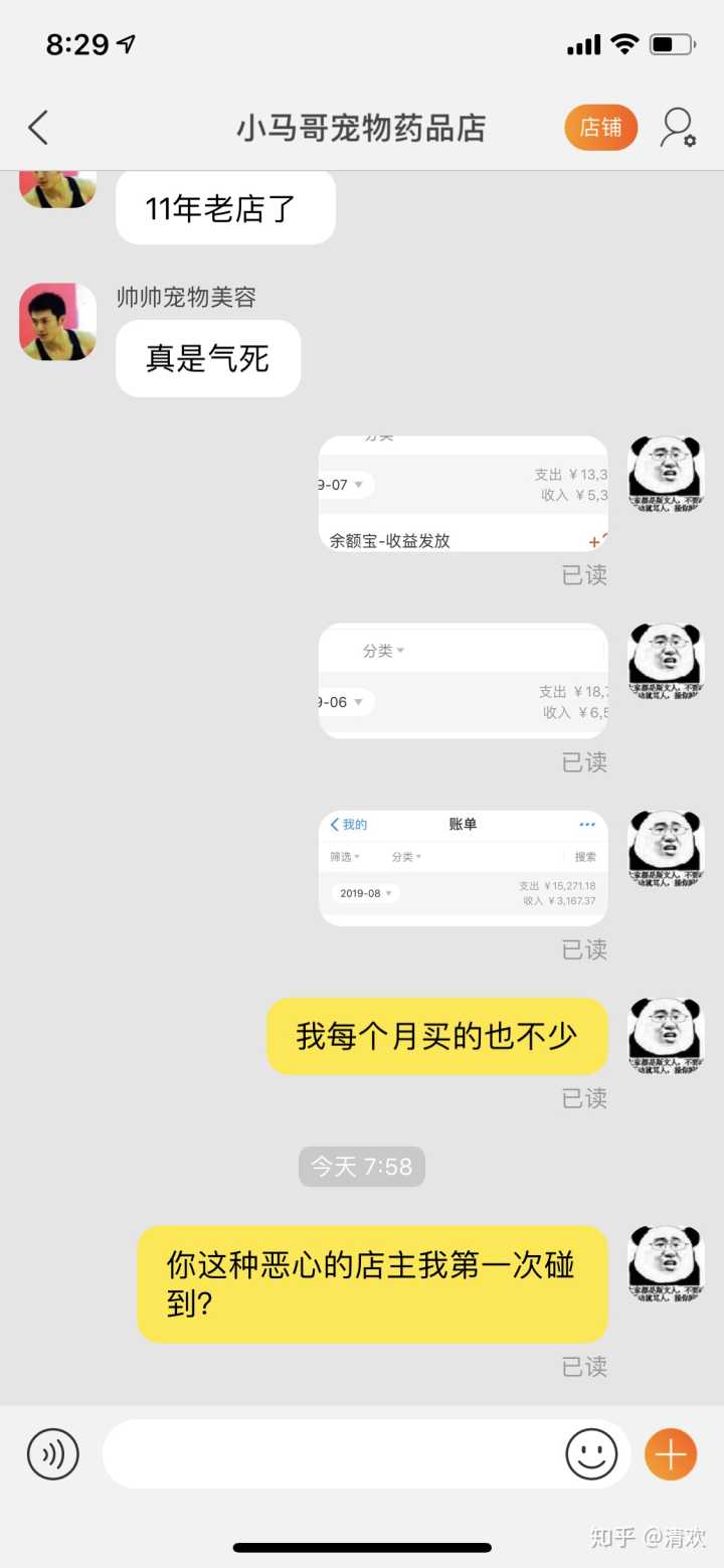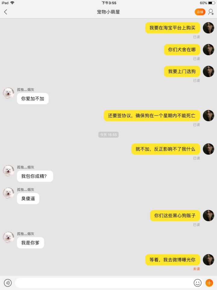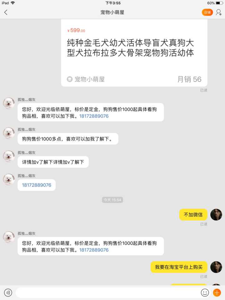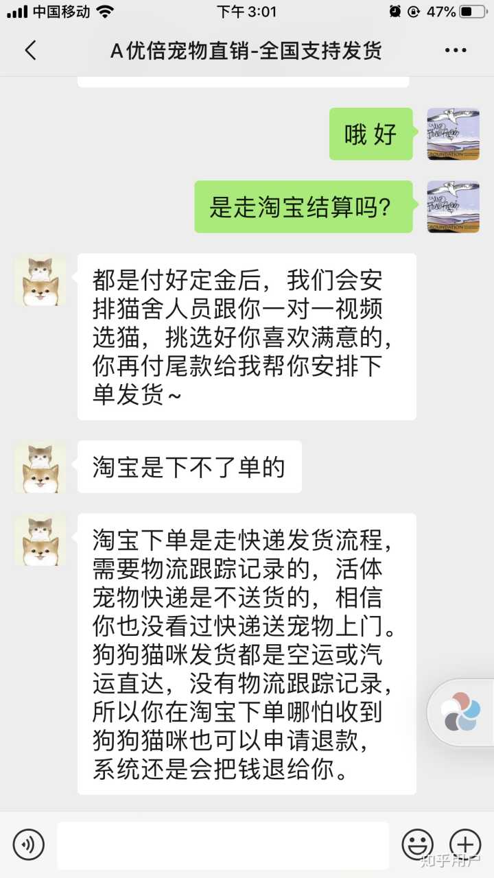我当时还问了能不能走淘宝交易,对方回答走淘宝怕收到宠物不付款。现在想想我当时居然相信了,还信了他说的什么“我们是十几年的老店”。