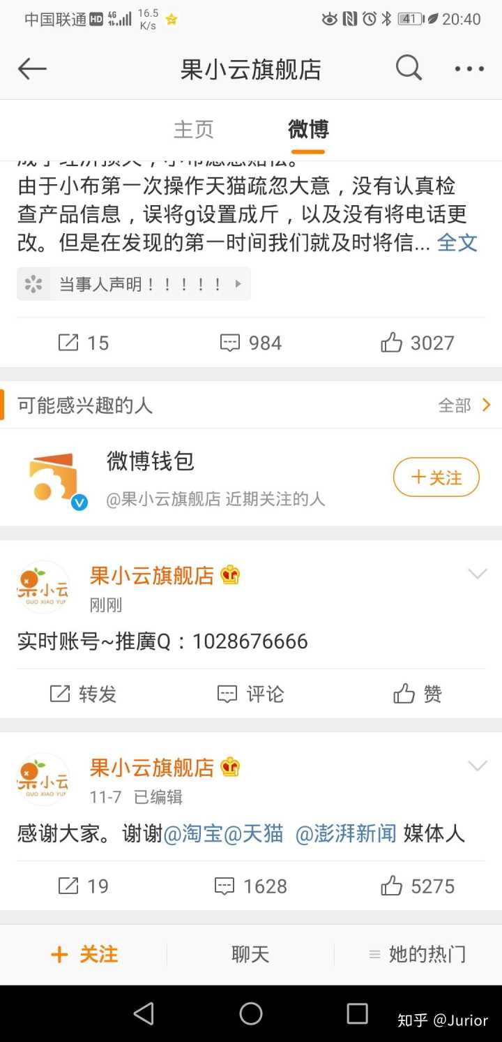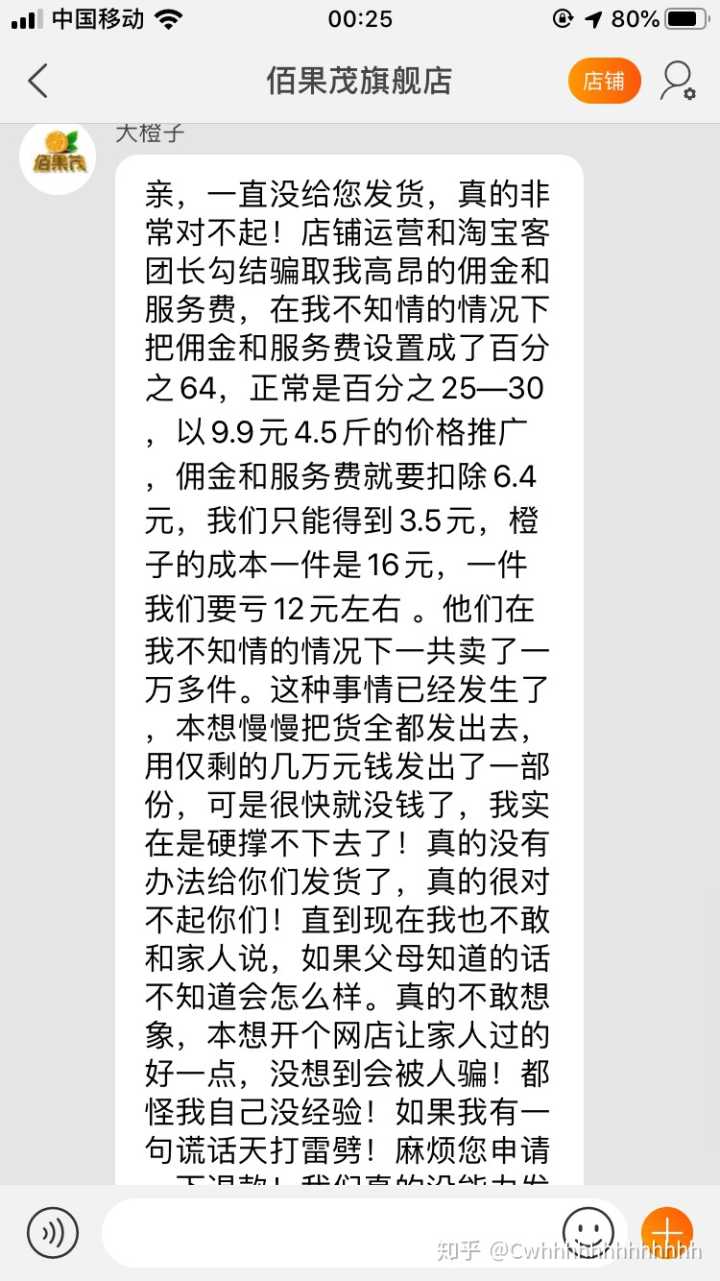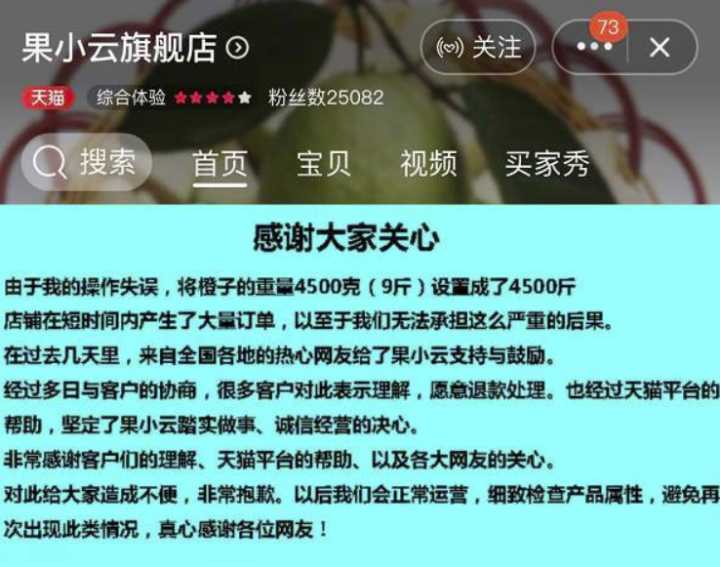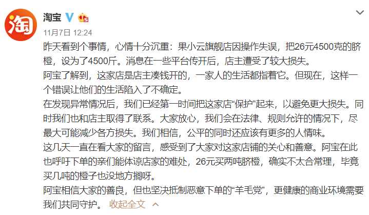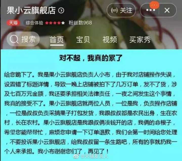 怎么看待知名博主「路人 A-」趁淘宝农民店家操作失误,鼓动粉丝刷单七百万人民币导致店家倒闭一事? 爱开淘 十一月 29, 2019 业务发展 20 评论 1407 围观 一些新的消息: 如何看待果小云视频中所说:“我的渠道多到你无法想象”还要求500元私了? ———【最新进展】平台方回应:在发现异常后,已第一时间将这家店「保护」起来,以避免更大损失,也和店主取得了联系;会在法律、规则允许的情况下,尽最大可能减少各方损失。 [图片] 事情发生是这样的:淘宝马 x 家的橘子由于操作失误,标价标成了 20 多块卖 4500 斤。我们可以从…