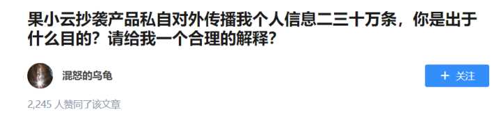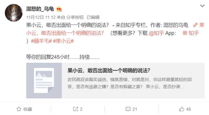 被抄袭的原店主@混怒的乌龟,在知乎、微博连连发文指责果小云抄袭自家产品并且私自传播个人信息。