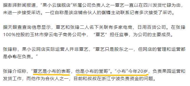 疑点二:果小云负责人小布自称店铺是自己和叔叔凑钱开的,两个人都是农民。
