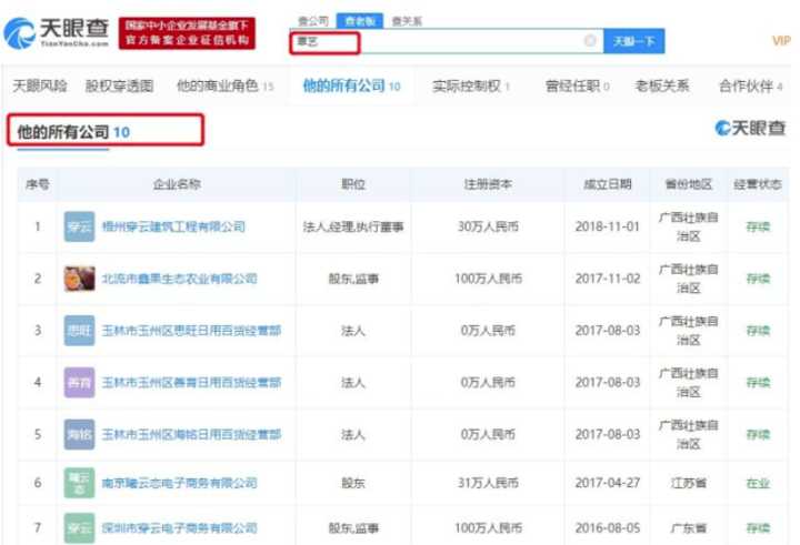 他旗下有10间公司,其中7家公司在广西,没有一家在四川。