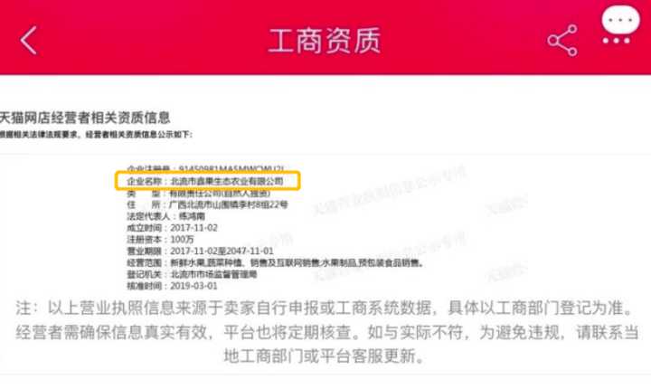 随后小雷查了查果小云旗舰店的认证公司,叫“北流市鑫果生态农业有限公司”,住所广西。