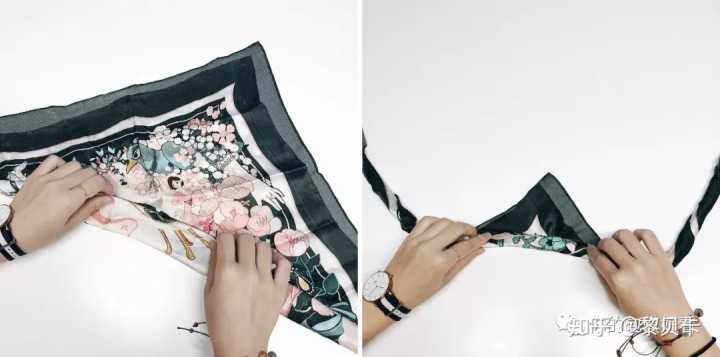 ⭐️ Step 1:首先要处理好丝巾部分,把丝巾叠成长条形状。如果是窄丝巾,这一步就能省点力气了。