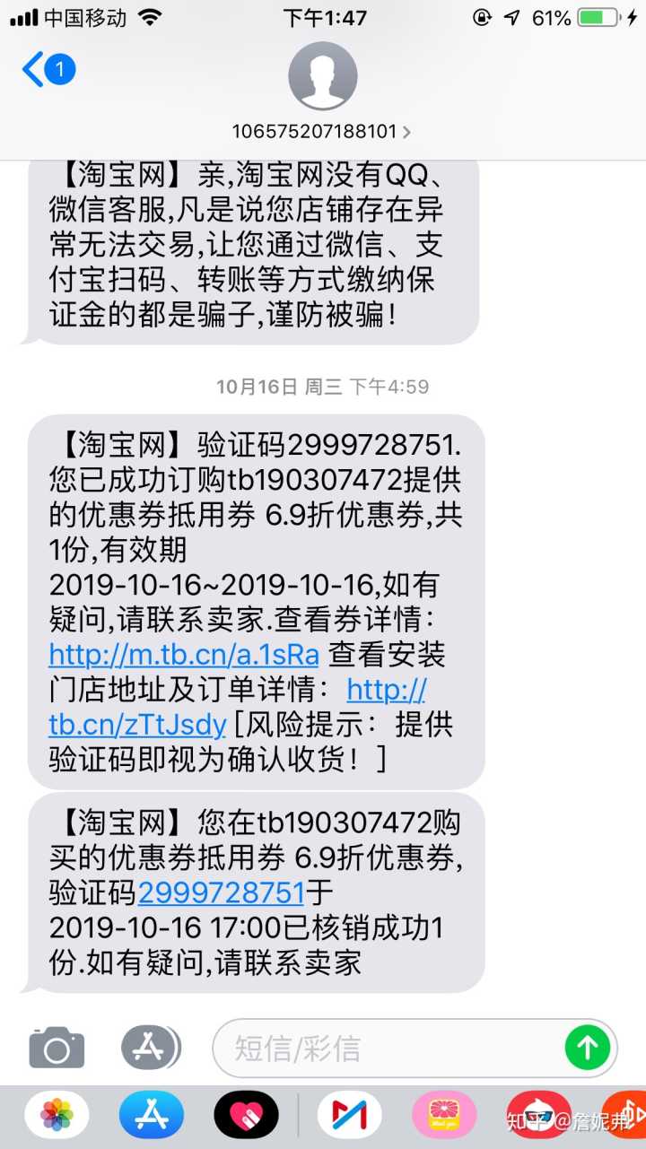 付款完成后,店家就立刻发信息了“淘宝发给你的短信 验证码发给我亲” 我当时也没多想,以为是他需要在他系统那边需要我这边的验证码好给我办理优惠券,我随手看了一下短信里面的验证码,就发给他了。