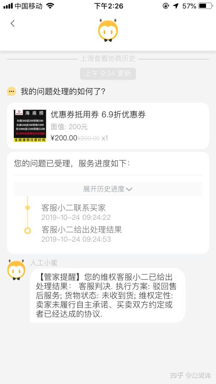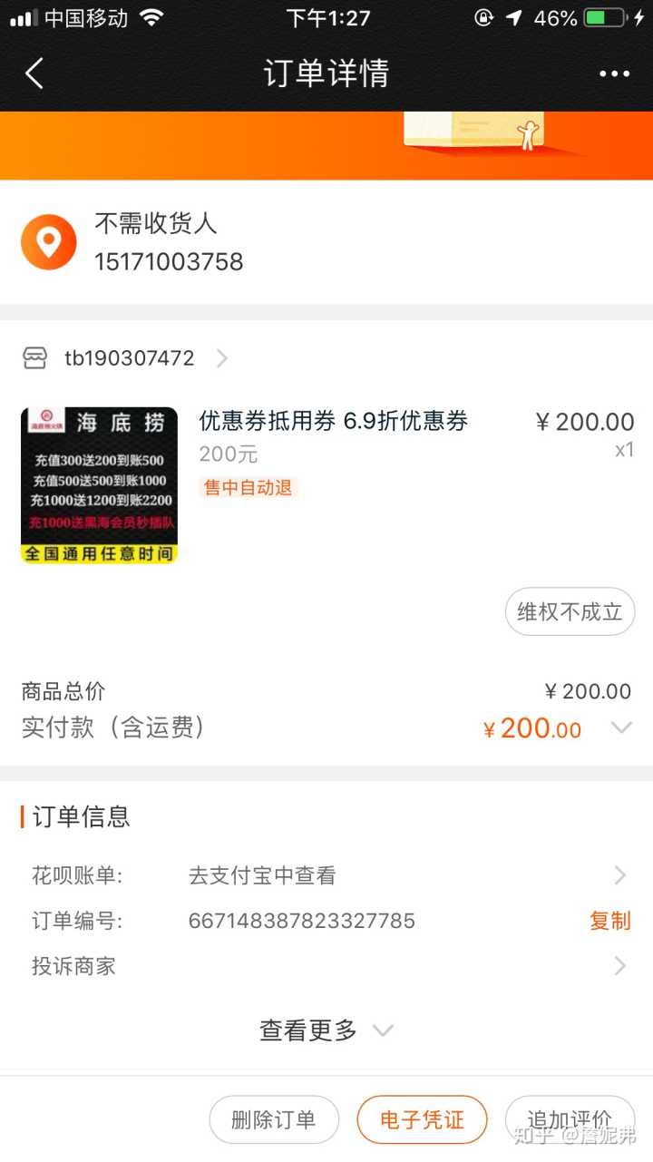 近几天遇到的,因为贪便宜+手欠+好奇……在淘宝搜索了“海底捞优惠券”其他的有销量的都看了一遍,觉得优惠力度不够大,就点进了搜索排名第一(第一一般都是广告位),里面没有评论的那个,优惠非常大呀,诺,下图就是我拍的订单,订单图片显示的优惠信息。