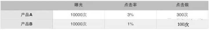 也就是淘宝的直通车广告收入=单次点击价格*点击次数,如果你是淘宝,让谁排名在前面?我们来看下面两款产品的曝光与点击: