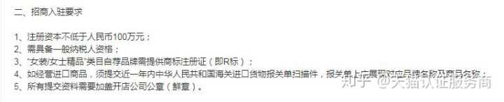 如果题主想要自己入驻天猫的话,首先得有公司(企业营业执照)和商标,除此之外,就得看自身产品是处于天猫什么类目,根据天猫入驻要求提供相应的行业资质,以“女装/女士精品”类目为例。