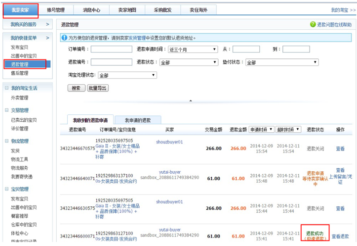 订单查询方法:进入‘卖家中心-我是卖家-退款管理’