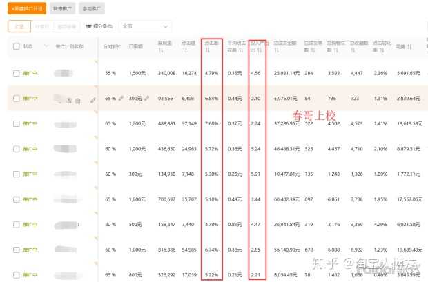 根据测款的情况,选出我们的潜在爆款,指标很简单,点击率、收藏加购比,一般在女装点击率在10%左右、收藏加购在20%左右还比较不错(纯属个人经验),可以加大力度推。这个爆款打造过程中,确定了要推的潜在爆款后,首先就是想办法降低PPC,降低PPC的办法很多,经常用的就是缓慢拖价法。能够顺利降下PPC的产品,多是点击率不错、收藏加购不错、ROI不错的,如果你的PPC降着很有难度,就回过去看下这几个指标,是不是差距还比较大,根据指标的情况,来做相应的调整。如果我们的第一步达成了,PPC已经明显降下来了,这个时候女装的操作中,关键的一步就来了,那就是多词多计划推广。通过多词多计划推广同一个产品,让这个产品在短时间内拿到更多的流量,真是爆款(点击率、转化都不错),这些流量会带来更大的坑产,良性循环就行成了,就可以等着更多的流量来了。爆款的打造过程中,一般是侧重于标准推广计划,但是定向计划做的好,可以给我们带来意想不到的手淘首页流量,在这个过程中我们也不能忽略。(以下为多款多计划推广)