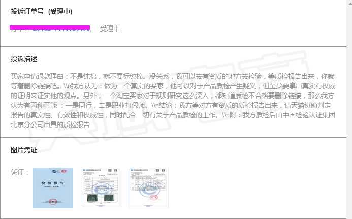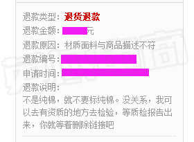 买家购买后联系客服,声称自己做了15年的质检工作,可以肯定产品棉含量不达标,以材质面料与商品描述不符为由申请退款。同时还说等质检报告出来,卖家就等着删除链接。看到这个退款说明,我们立马产生两个判断:一、这个买家很有经验,熟悉淘宝规则,知道如果质检不过关,可以申请售假删除链接。那么这样的买家我们可以认为是一职业打假师。二、这个买家是同行,同行当然清楚行业规则。