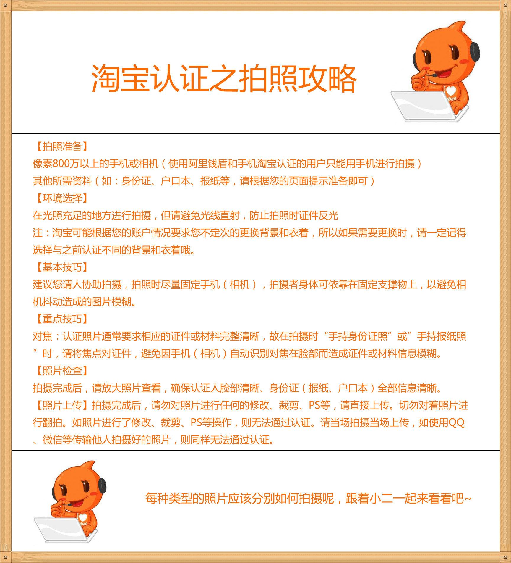 淘宝认证拍照攻略 爱开淘 三月 22, 2016 我要开店 0 条评论 2111 围观 淘宝认证其他知识链接: 新开店、店铺释放后重新开店的用户:【淘宝开店认证】 【淘宝开店认证常见问题】 【淘宝开店认证操作流程】 【淘宝开店认证审核不通过原因的解释说明】