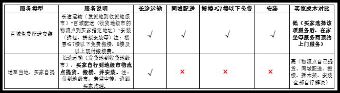 1.1“免费配送安装”服务:指买家在淘宝上购买带有”免费配送安装”服务的大件商品时,卖家承诺对于其店铺内含有”免费配送安装”服务的商品,如买家购买该商品时填写的详细收货地址(以下统称”收货地址”)在卖家承诺提供送货上门并安装的区域内,则向买家免费提供送货到买家收货地址并安装(包括但不限于长途干线运输、同城配送、搬楼、入户安装)的特殊服务。