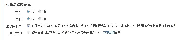 怎么才能取消七天无理由服务? 大文 四月 9, 2016 消费者保障服务 0 条评论 3421 围观 亲,目前不是所有“类目”都必须加入“7天无理由退货”服务,关于是否要加入“7天无理由退货”服务,具体类目点此查看 您也可以以“商品发布页面”中【服务保障】能否可以取消打勾为准。 可取消的类目,发布页显示如下(勾选可取消): 不可取消的类目,发布页显示如下(方框张的勾选是灰色,不可能更改):
