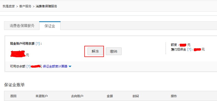 我的消保保证金要怎么解冻? 大文 四月 9, 2016 消费者保障服务 0 条评论 1816 围观 第一步:您先进入解冻保证金页面,解冻入口:【卖家中心】-【客户服务】-【消费者保障服务】-【解冻】 第二步:点击申请解冻,解冻申请提交以后,若符合条件,系统会立即解冻保证金,解冻后相应支付宝不可用余额转为可用余额,您可以点此查看。 温馨提醒 1.若解冻失败,您可以查看提示并及时处理交易哦。 2.消保保证金为什么被扣具体请点此查看 3.保证金计划相关问题请点此查看