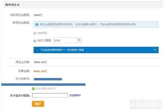 例如:卖家现有1000元保证金,选择自定义额度为5000元,即自主承诺保证金额度为5000元,则只需要补足4000元差额,故系统会显示实缴金额为4000元,卖家只需要确认无误即可输入支付宝支付密码完成。