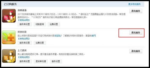 如何申请退出货到付款业务? 大文 四月 11, 2016 卖家工具及服务 0 条评论 1963 围观 亲,您如需退出COD货到付款业务,您可以登录【淘宝网】-【卖家中心】-【物流管理】-【物流服务】点击”退出服务”即可,如下图: