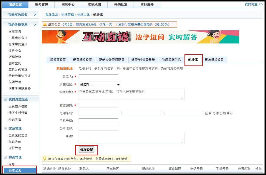 卖家如何添加发货、取货、退货地址? 大文 四月 11, 2016 卖家工具及服务 0 条评论 1504 围观 您可以进入“卖家中心”—“物流管理”—“物流工具”—“地址库”中可以编辑/添加/删除发货、取货、退货的地址。 注意:最多可添加20条地址;电话号码、手机号码选填一项,备注和公司名称为可填项,其余均为必填项。