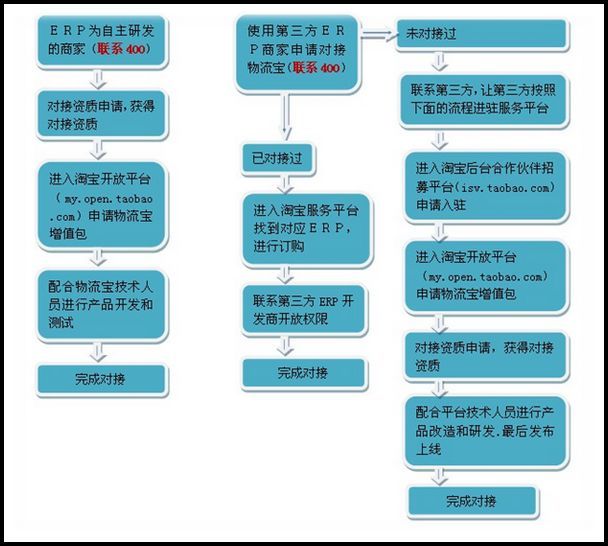 a)商家联系ERP第三方开发商,让第三方拨打400-800-0808-转7转1提交申请,第三方开发商按照400小二引导进入淘宝后台合作伙伴招募平台(isv.taobao.com)申请进驻【第三方可以在ISV平台最下方点击合作咨询联系对应小二咨询对接要求】,并根据平台小二要求配合物流宝技术人员完成对接研发及测试,直至产品发布上线。
