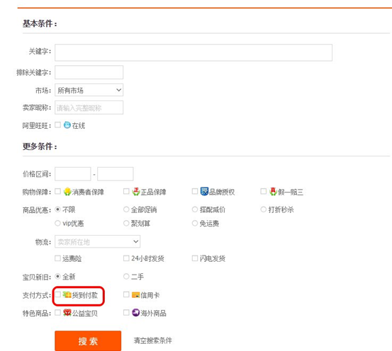 3、 亲,您还可以登陆淘宝网首页,找到搜索框, 点击搜索框后面的 【高级搜索】,进入到淘宝高级搜索页面,点击图五中的 【货到付款】就可以中找到货到付款的商品,随意挑选即可,如下图: