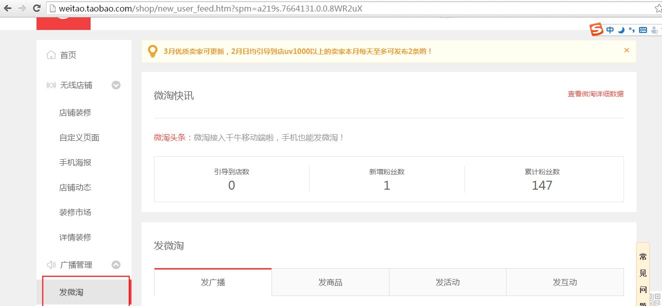 怎么在电脑上发布微淘? 大文 四月 13, 2016 卖家工具及服务 0 条评论 2352 围观 亲,目前可通过以下四个路径发布微淘: 1.进入【无线运营中心】-【广播管理】-【发微淘】 。目前支持:发广播、发商品、发活动、发互动。 2.千牛移动端-流量中心。 3.千牛pc端插件。 4.淘小铺。