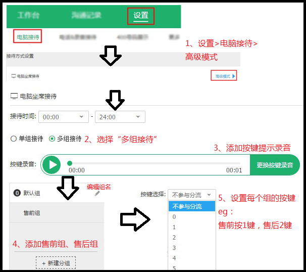 按键录音是指买家听到的按键提示,例如”售前咨询请按1,售后咨询请按2,投诉建议请按0“