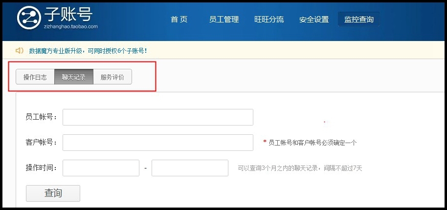 主账号怎么查看子账号与客户之间的聊天记录? 大文 四月 13, 2016 卖家工具及服务 0 条评论 2127 围观 点此链接进入子帐号管理界面,登录主帐号,点击【管理我的子帐号】-【监控查询】,如图: 然后选择”聊天记录“,填写要查看的子帐号名称和客户名称,选择时间段即可,如图: