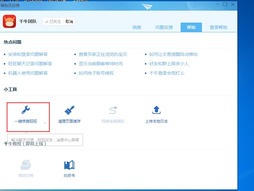 千牛聊天消息看不到,怎么办? 大文 四月 13, 2016 卖家工具及服务 0 条评论 5375 围观 问题现象:聊天框的上方空白、收发的消息看不到、聊天记录重复显示一句话等 解决方案:请先将千牛升级至最新版本,然后在千牛右上角【帮助与反馈】里点击【一键修复旺旺】修复哦。 具体可以查看以下操作方式: