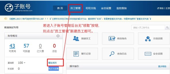 如何获取子账号?子账号如何使用? 大文 四月 13, 2016 卖家工具及服务 0 条评论 1661 围观 子账号获取途径:主帐号进入【卖家中心】-【店铺管理】-【子账号管理】,首先开启子账号服务,进入首页看有查看 赠送的子账号领取方式:进入子账号后台首页,点击“领取” 若没有“领取”按钮,则进入“员工管理”管理子账号: 子账号如何使用? 子账号可以登录“卖家中心”“千牛”等淘宝网工具,登录形式为“主账号:子账号”